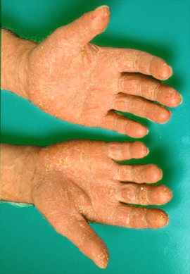 Keratotisk håndeksem ses i håndfladerne som fortykkede, skællende områder. Der er aldrig blærer og kun let kløe. Rammer overvejende mænd i alderen 40-60 år.